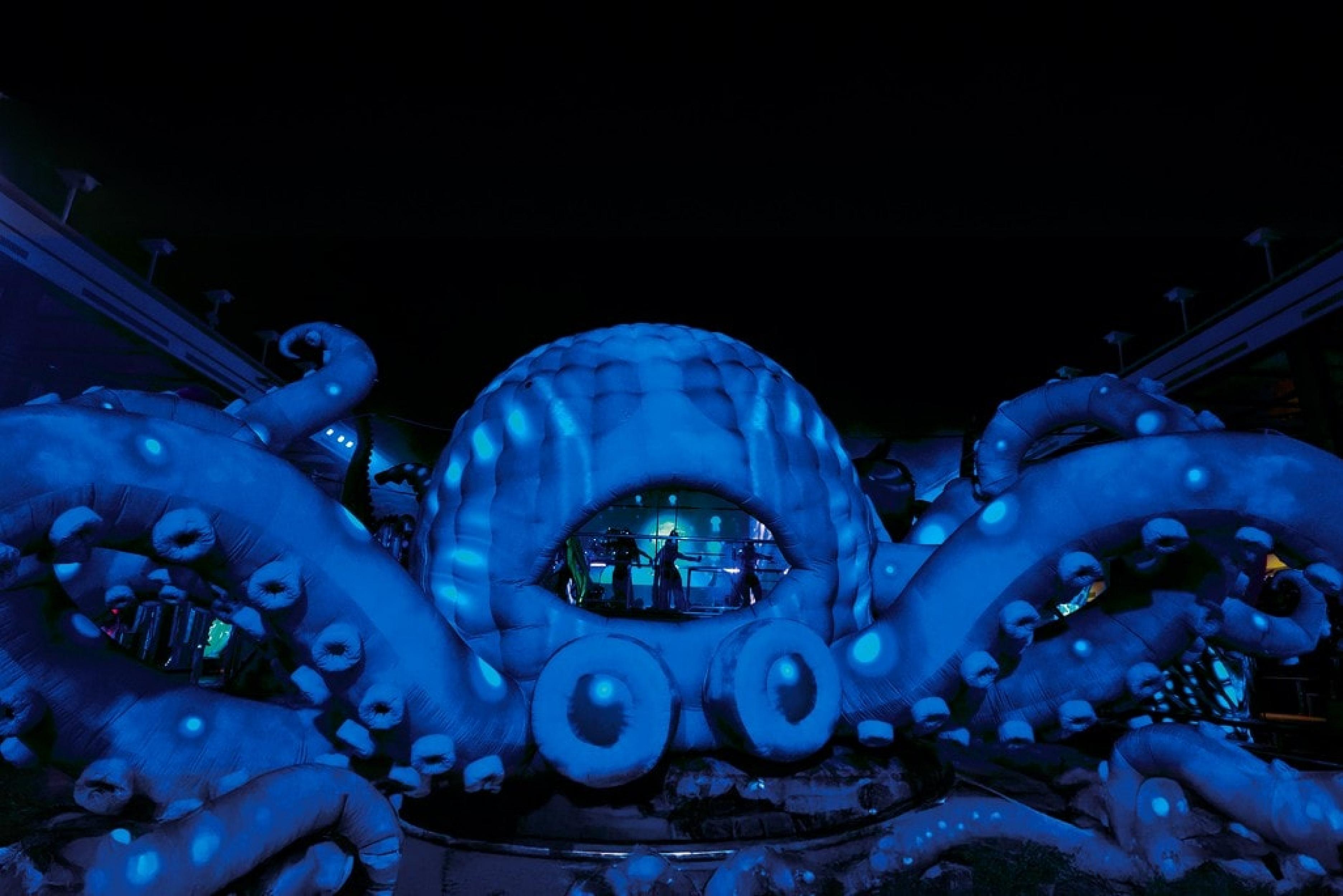 Al calare della notte, la nave attraversa il Calypso Deep, il punto più profondo del Mar Mediterraneo. Migliaia di metri d’acqua separano la superficie da un abisso antico e immobile, che custodisce il mistero del mare, dove la luce non arriva e il silenzio è totale. Sul ponte, suoni e luci ricreano l’atmosfera del fondale. Creature ispirate al mondo marino emergono nella notte. Un tributo essenziale e potente al mistero del mare.