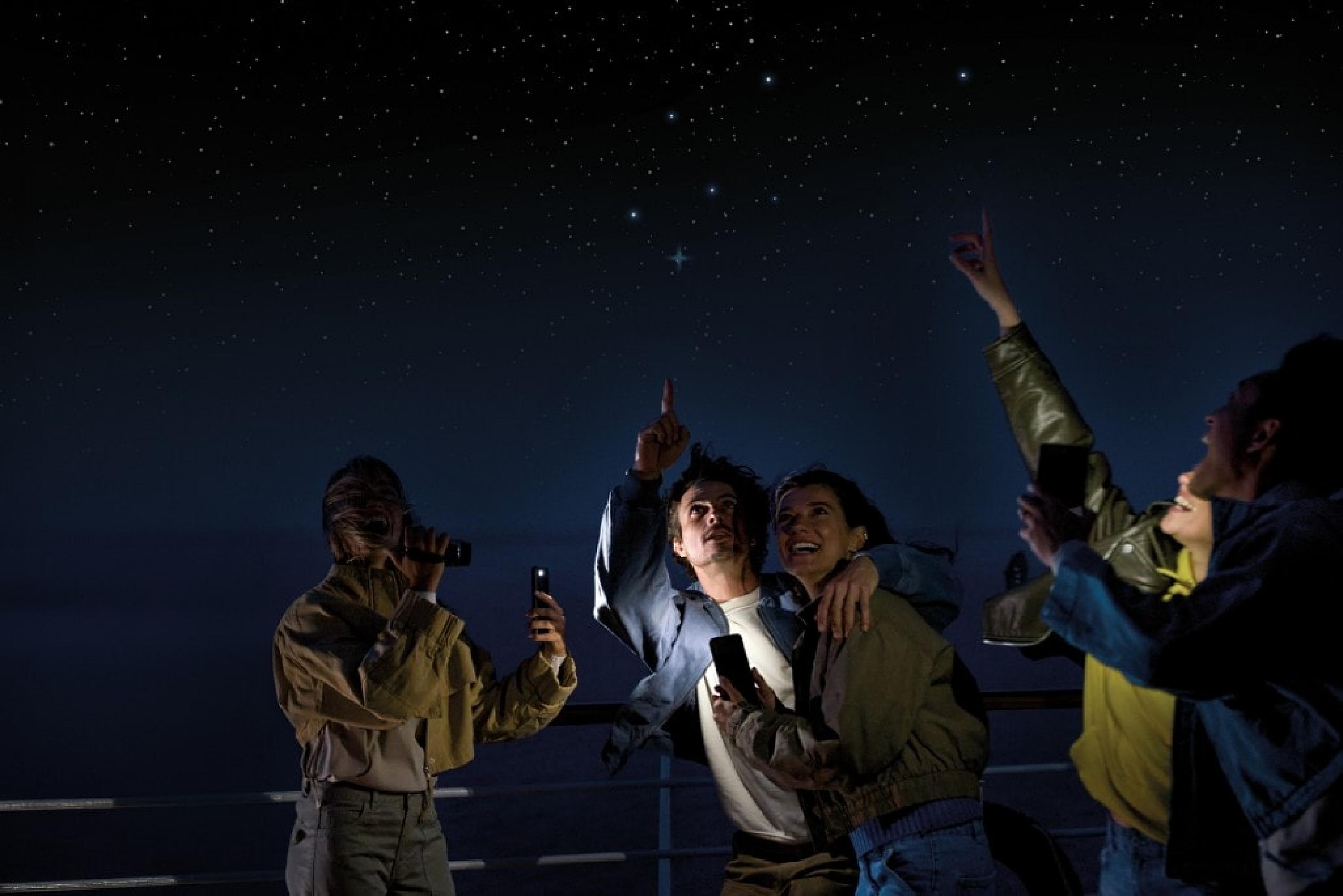 È notte e la nave raggiunge il punto più buio del Mar Ionio uno dei rarissimi luoghi dove il cielo appare ancora nitido: senza luci artificiali, senza coste visibili, solo mare e stelle. Tutte le luci della nave si spengono. Nessun riflesso. Nessun disturbo. Solo il cielo, protagonista assoluto. Con l’introduzione del comandante e l’app Stellarium, è possibile orientarsi tra costellazioni, pianeti e galassie. Un’esperienza possibile unicamente in navigazione, solo in quel preciso punto di mare.
